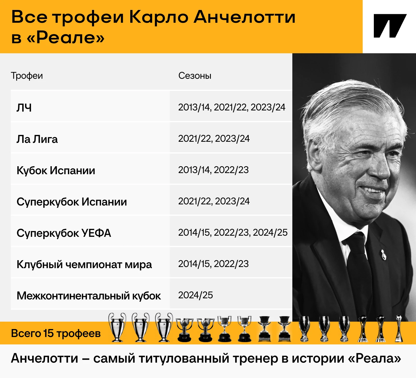 Анчелотти – самый титулованный тренер «Реала». 15 трофеев за шесть лет 🏆