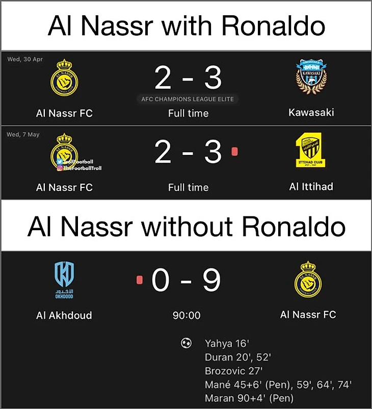 Кажется, что болельщики «Аль-Насра» стали что-то подозревать, так как появились подобные мемы.