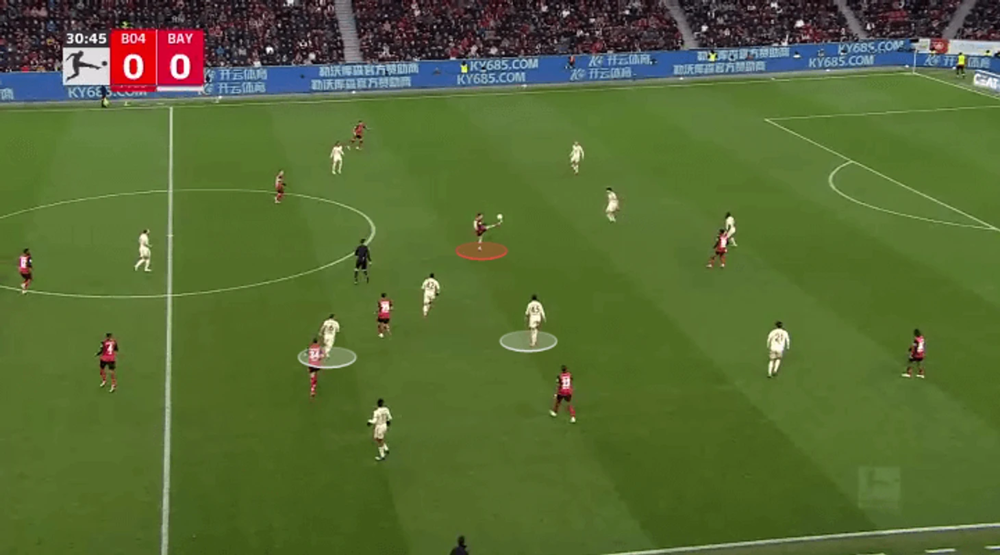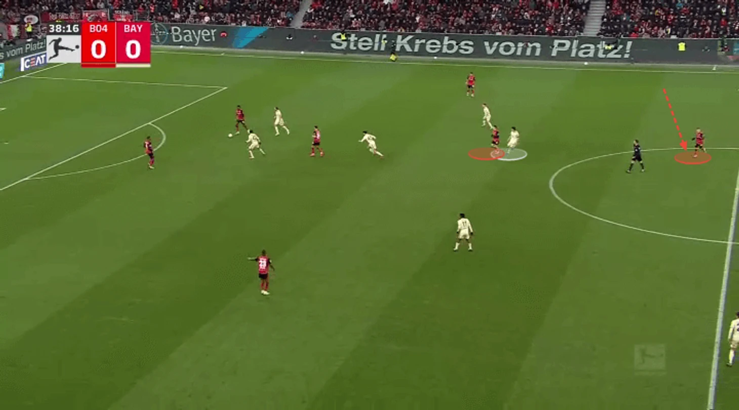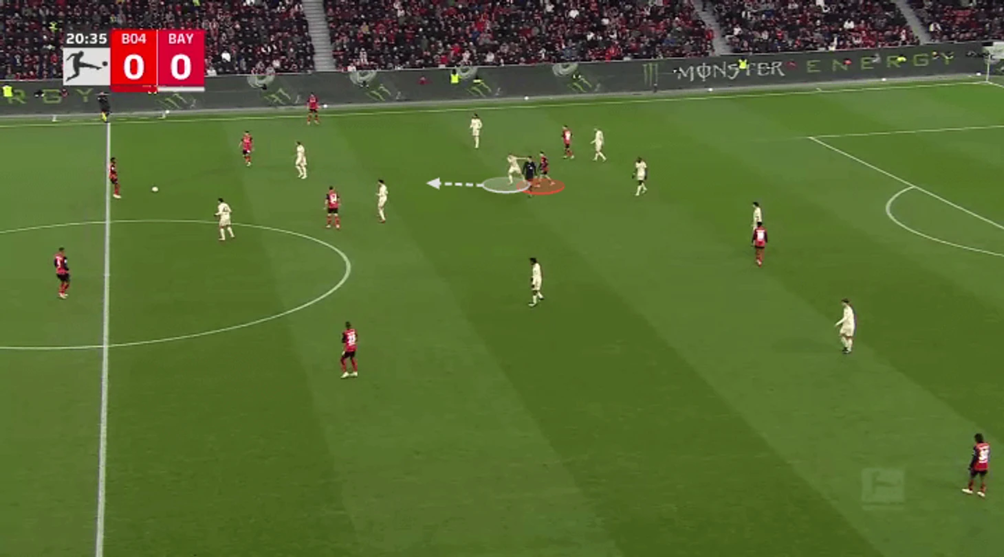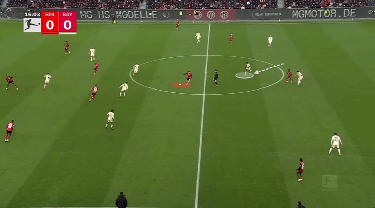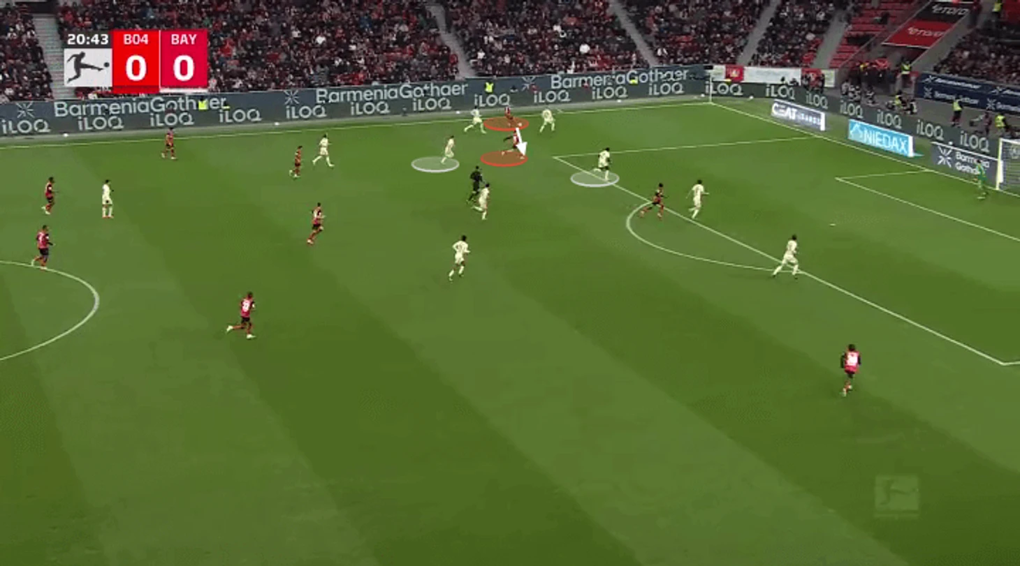 Виртц также умеет находить пространство, двигаясь вбок. Здесь, при розыгрыше мяча в обороне, он оглядывается через плечо и понимает, что оба центральных полузащитника «Баварии» находятся на его половине поля. Поэтому он бежит прямо к открытой части поля.