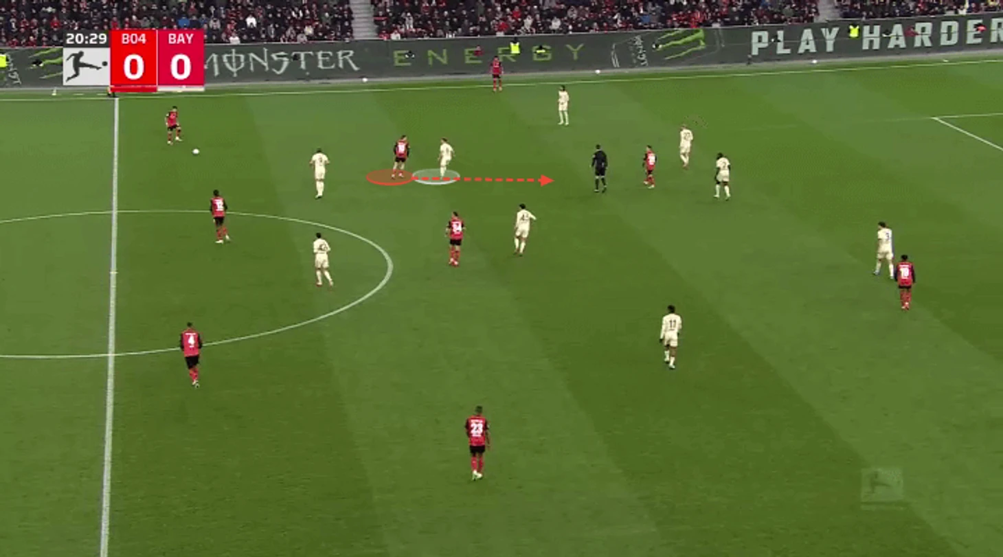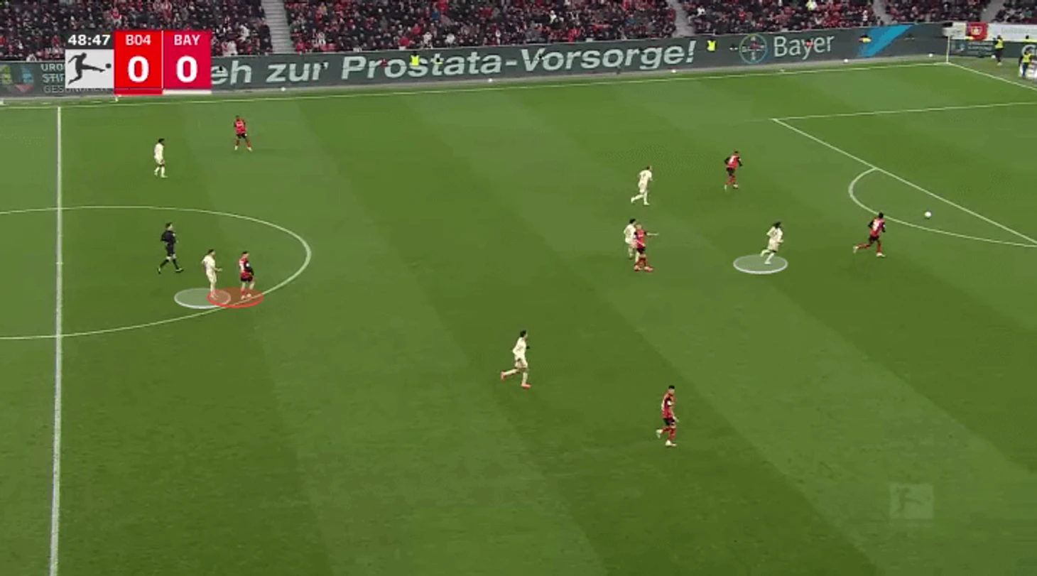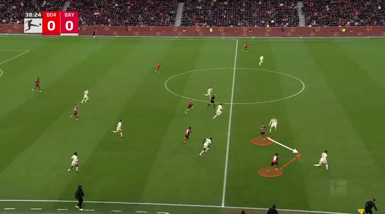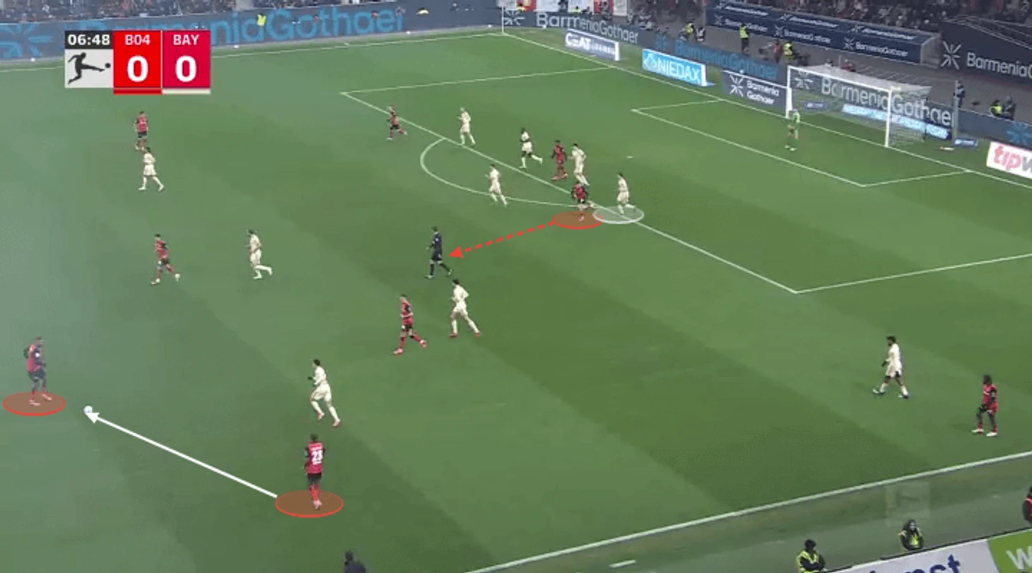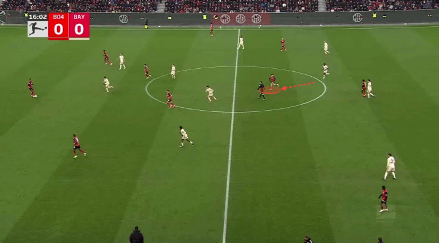 Виртц также умеет находить пространство, двигаясь вбок. Здесь, при розыгрыше мяча в обороне, он оглядывается через плечо и понимает, что оба центральных полузащитника «Баварии» находятся на его половине поля. Поэтому он бежит прямо к открытой части поля.