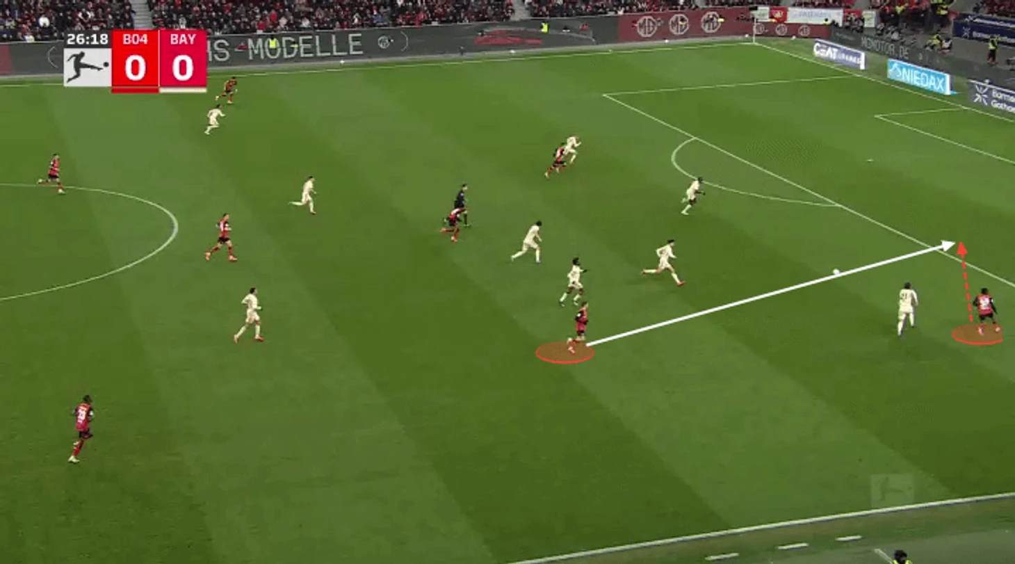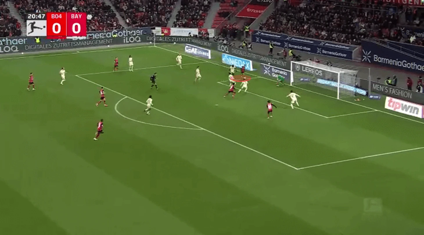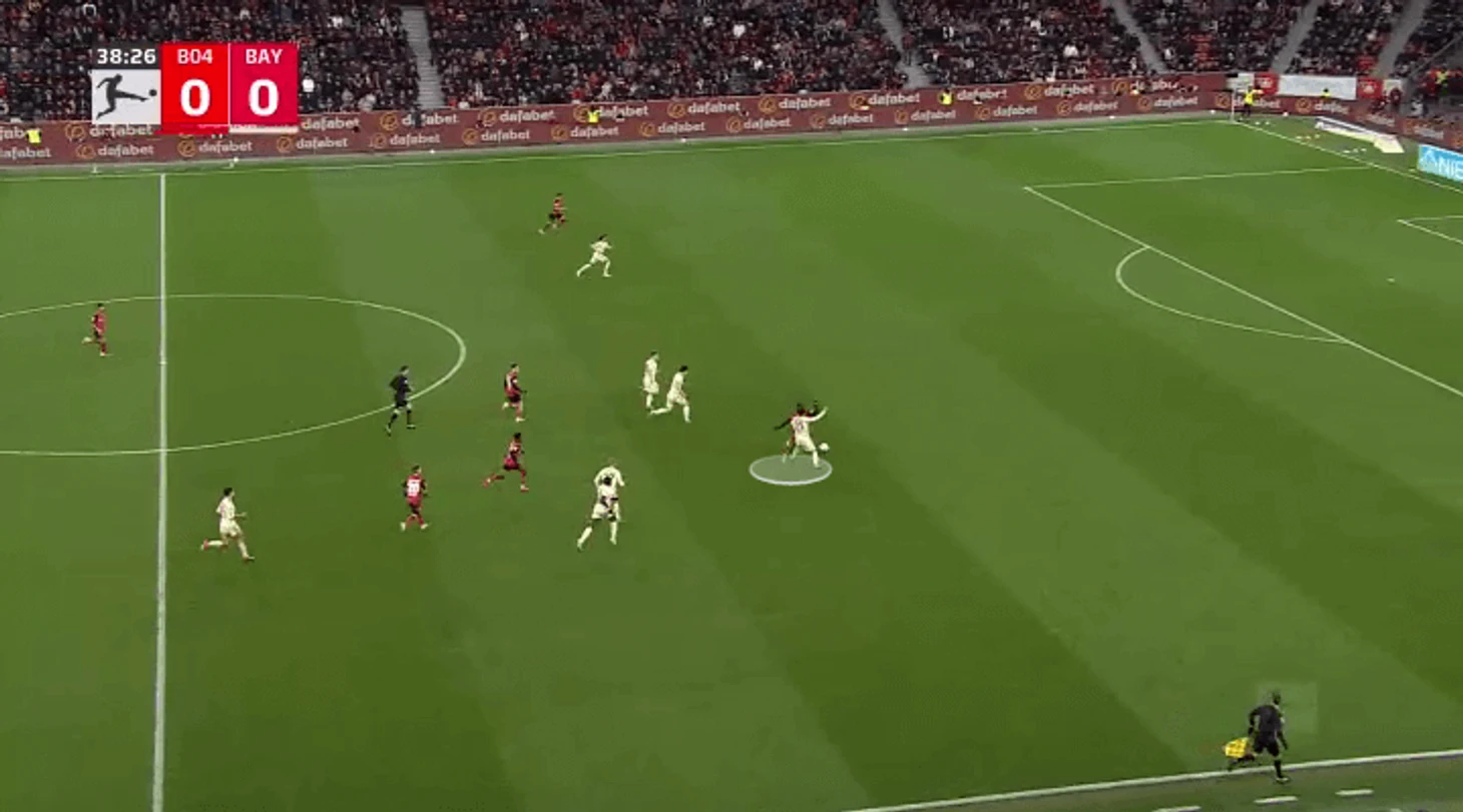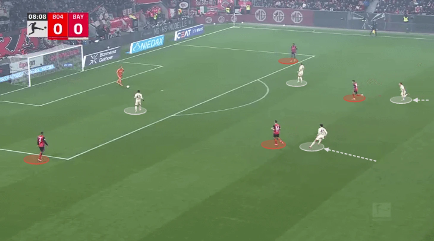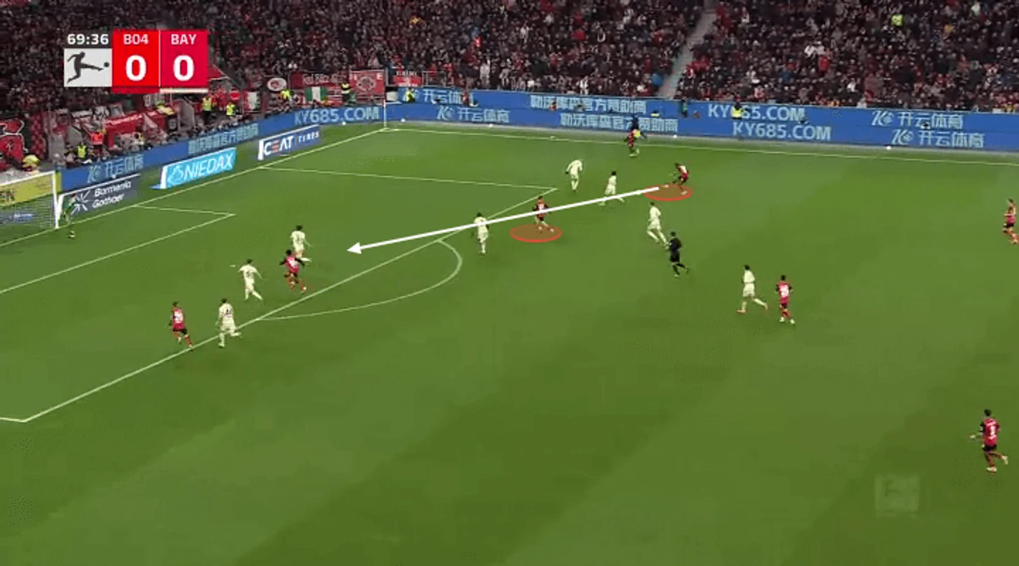 Виртц также умеет находить пространство, двигаясь вбок. Здесь, при розыгрыше мяча в обороне, он оглядывается через плечо и понимает, что оба центральных полузащитника «Баварии» находятся на его половине поля. Поэтому он бежит прямо к открытой части поля.
