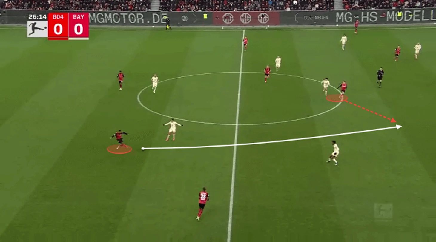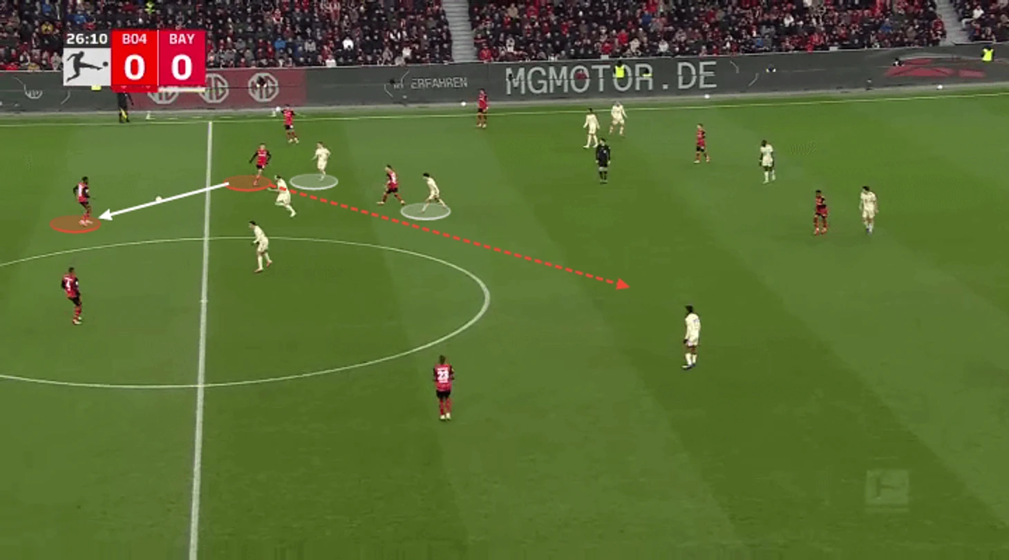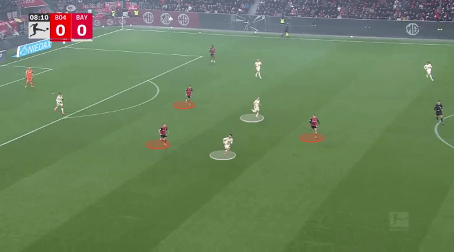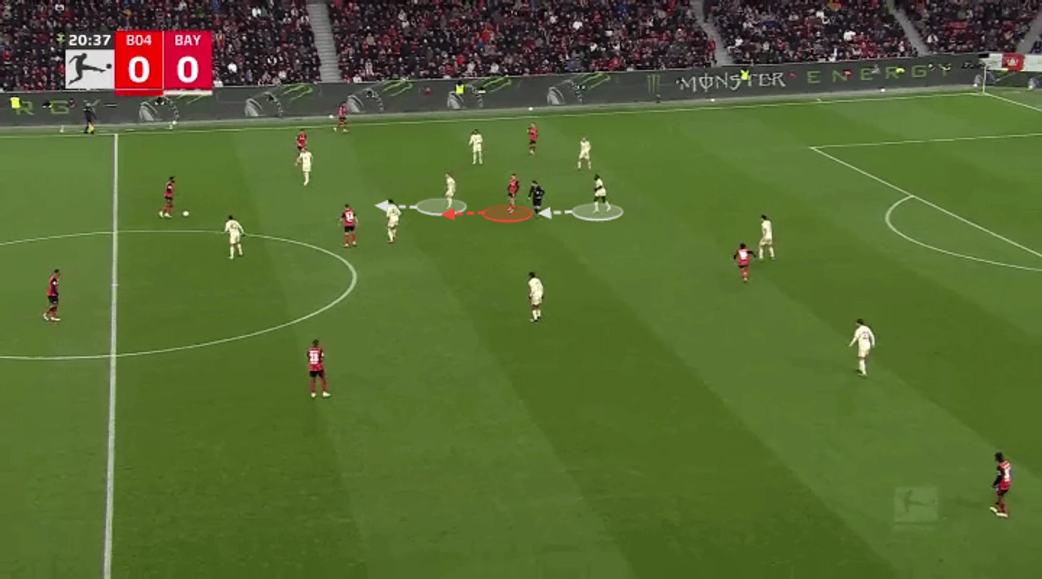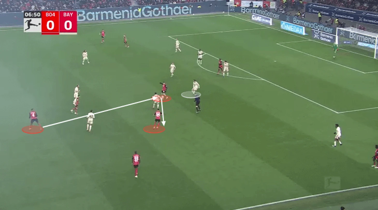 Виртц также умеет находить пространство, двигаясь вбок. Здесь, при розыгрыше мяча в обороне, он оглядывается через плечо и понимает, что оба центральных полузащитника «Баварии» находятся на его половине поля. Поэтому он бежит прямо к открытой части поля.
