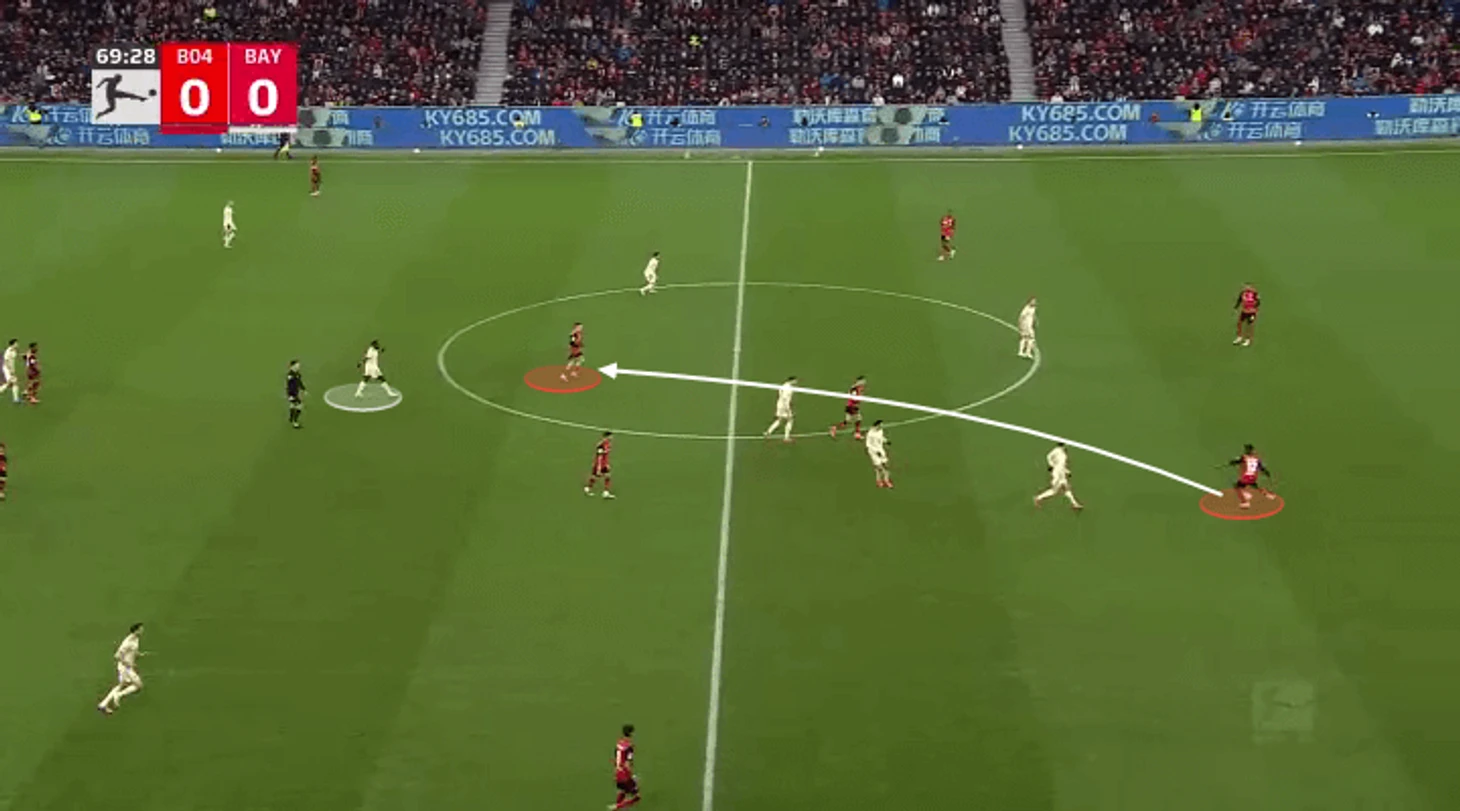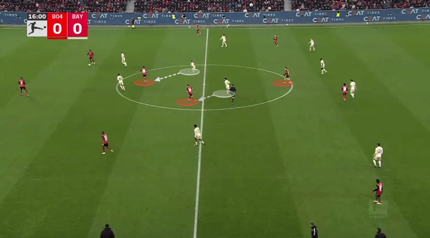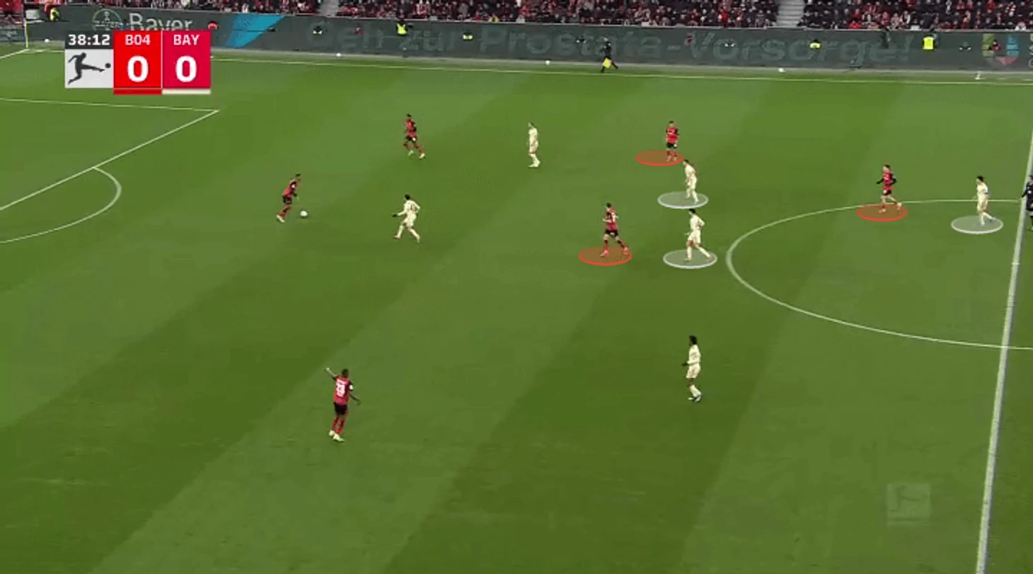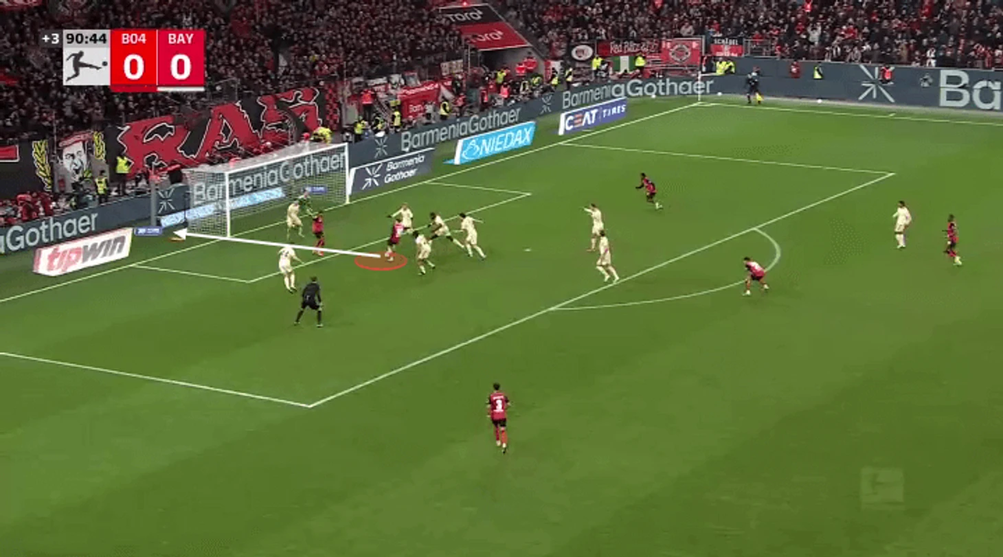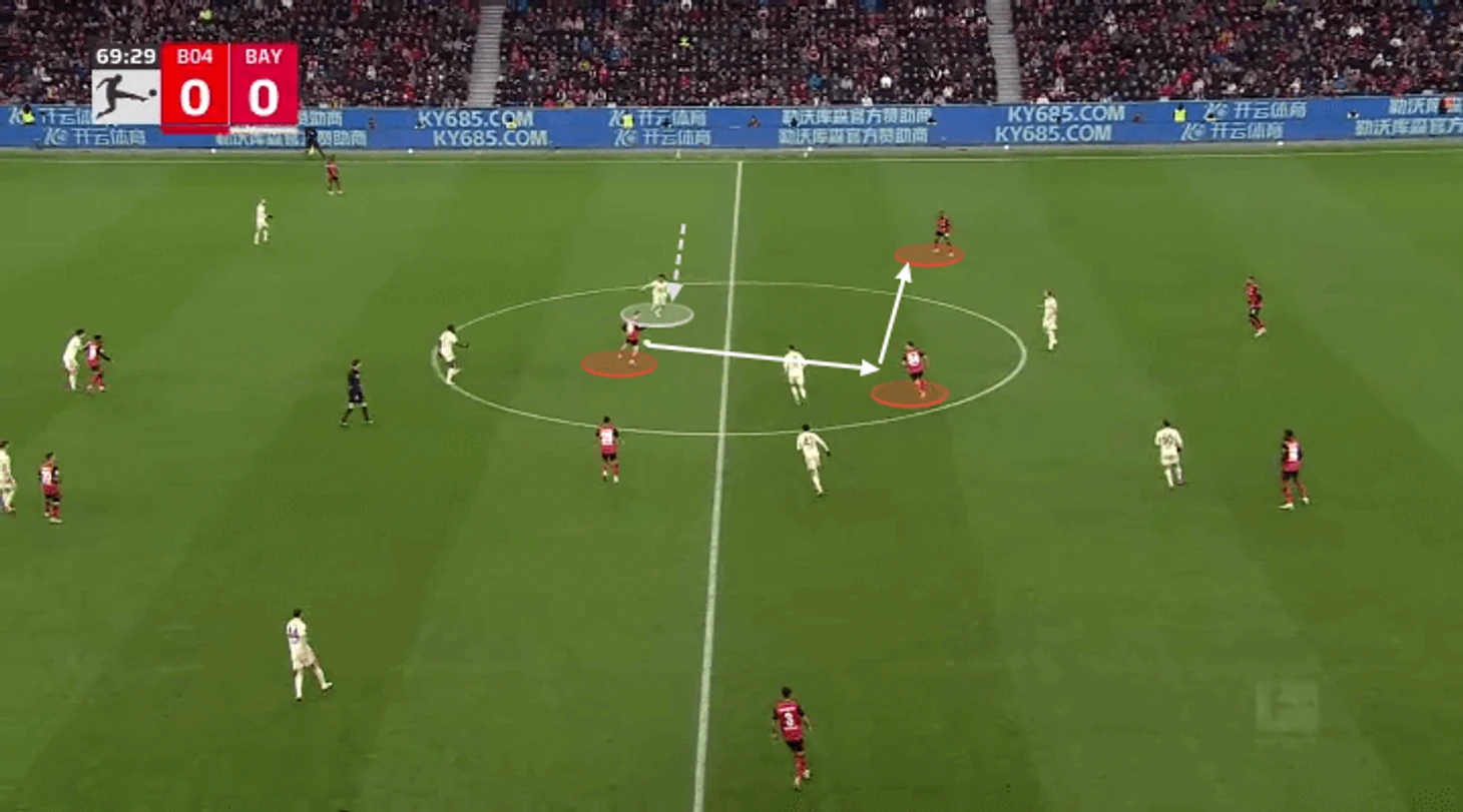 Виртц также умеет находить пространство, двигаясь вбок. Здесь, при розыгрыше мяча в обороне, он оглядывается через плечо и понимает, что оба центральных полузащитника «Баварии» находятся на его половине поля. Поэтому он бежит прямо к открытой части поля.