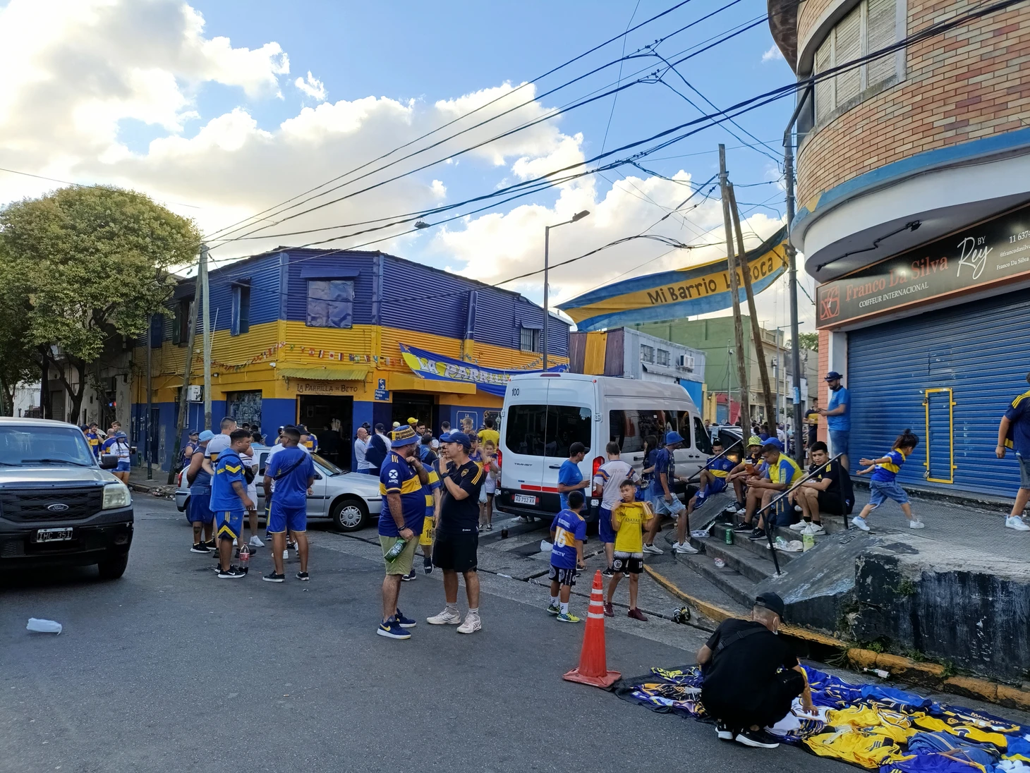И буквально через пару кварталов красно-зелено-желтые дома превратились в сине-желтые. И здесь уже жизнь бурлила во всю: болельщики распивали напитки и распевали песни, продавцы еды и одежды громко зазывали к себе, и везде на гриле жарили мясо. Я, конечно, сразу взял перекусить традиционный чорипан, прежде чем войти в толпу болельщиков.