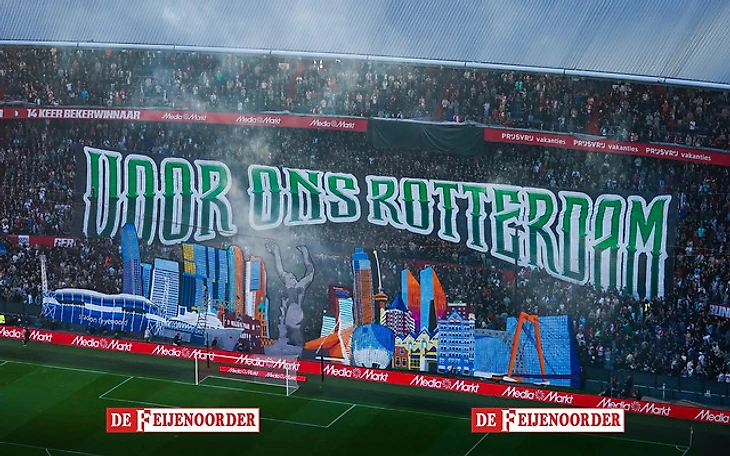 Сама по себе игра не представляла никакого интереса, поэтому заострим все свое внимание на фанатах хозяев, презентовавших впечатляющий перфоманс «За наш Роттердам!», состоящий из двух частей. В первой из них ультрас развернули 3 больших баннера с изображениями некоторых мест и достопримечательностей (в том числе и стадион «Де Кип») своего города в черно-белых тонах.