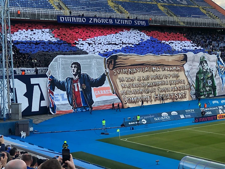 Но обо все по порядку и начнем мы со столичного дерби, в котором «Динамо» принимало «Локомотиву» — да, хорватские железнодорожники носят именно женское название. Ультрас же «синих» решили пройтись по военной тематике, подготовив к дерби красочное хорео «Всем болельщикам «Динамо», для которых война началась 13 мая 1990 года на стадионе «Максимир», а закончилась возложением их жизней на алтарь хорватской родины» с изображением фаната клуба сначала на стадионе и в фанатской одежде, а затем — в военной униформе во время боевых действий.