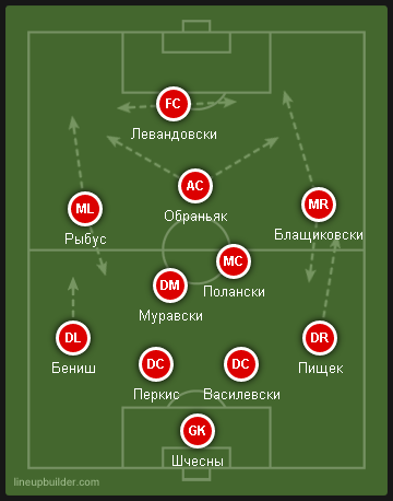 Опорный дуэт Ойгена Полански и Рафала Муравски, пожалуй немного более близок к обороне, чем надо — оба очень сильны и хороши в отборе, но их пасам не хватает разнообразия. Они скорее просто отдадут мяч фланг, чем придумают что-нибудь обостряющее. Полански будет играть чуть выше, но именно от Муравски можно ждать умного паса вперед. Оба могу пробить из-за пределов штрафной, но, скажем так, это не самая сильная их сторона.