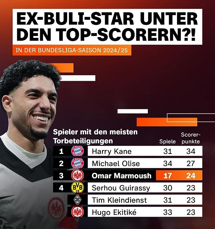 Мармуш стал лучшим бомбардиром «Айнтрахта» в Бундеслиге, по системе «гол+пас» он набрал 24 очка – 15 голов и девять ассистов. Омар занял третью строчку в списке самых результативных игроков немецкого первенства, не дотянул только до чемпионов Харри Кейна и Майкла Олисе. И это за 17 матчей!