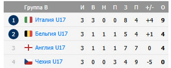 Англии необходимо было победить Чехию и ждать поражения от Бельгии — для квалификации хватало бы, к примеру, поражения Бельгии 0:2 и победы Англии 2:0 — ведь в случае равнества личных встреч (здесь у Англии и Бельгии была ничья 1:1, ибо в первом туре этот результат обеспечили Родригес у англичан и Фернандес у бельгийцев) и разницы мячей в игру вступает количество забитых мячей. И ведь Англия могла выйти в плей-офф! Бельгия не удержала счёт 1:0, добытый уже на 12-й минуте, и в итоге к 79-й минуте благодаря дублю Инасио проигрывала со счётом 1:2 — а Англия в то же время громила Чехию со счётом 4:1, где на голы Доумена, Родригеса, Хауэлла, Грея чехи сумели ответить лишь точным ударом Палашчака. Этот результат выводил Англию в полуфинал, но спустя 10 минут Чехия забила — после подачи углового мяч после удара в защитника попал к Ванеку, тот отдал пас на Потмешила, который навесил в штрафную, после чего в результате борьбы мяч оказался у Гуго Сохурека — его удар в касание с левой ноги изменил не только счёт на табло, но усложнил Англии задачу по выходу из группы. Гол Сохурека по итогу стал последним на групповом этапе, и, хоть Бельгия и проиграла Италии 1:2, победа со счётом 4:2 не помогла англичанам выйти из группы.