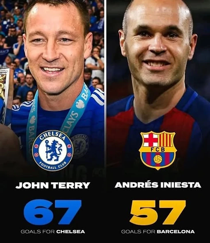 🗿 Джон Терри забил больше голов за Челси, чем Андрес Иньеста за Барселону, при том, что они сыграли соотносимое количество матчей за эти клубы.