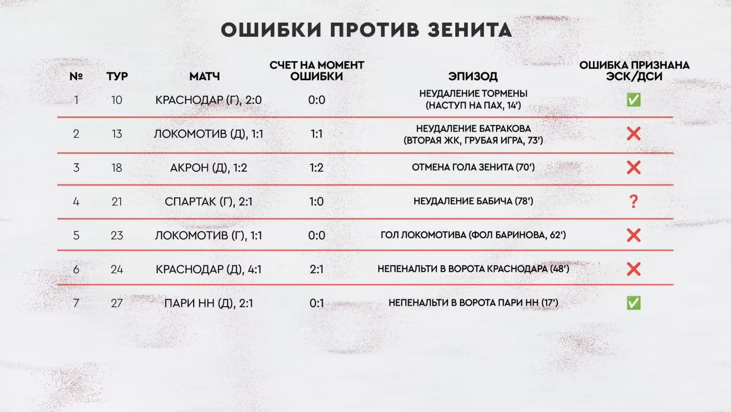 В пользу «Зенита» не назначались пенальти за нарушение правил против игрока на протяжении 65 матчей (45 в РПЛ, 18 в Кубке России и 2 в Суперкубке России) с 29 апреля 2023 по 5 октября 2024. За 1,5 года «Зенит» пробил 5 пенальти, но все из них были назначены за попадание мяча в руку.
