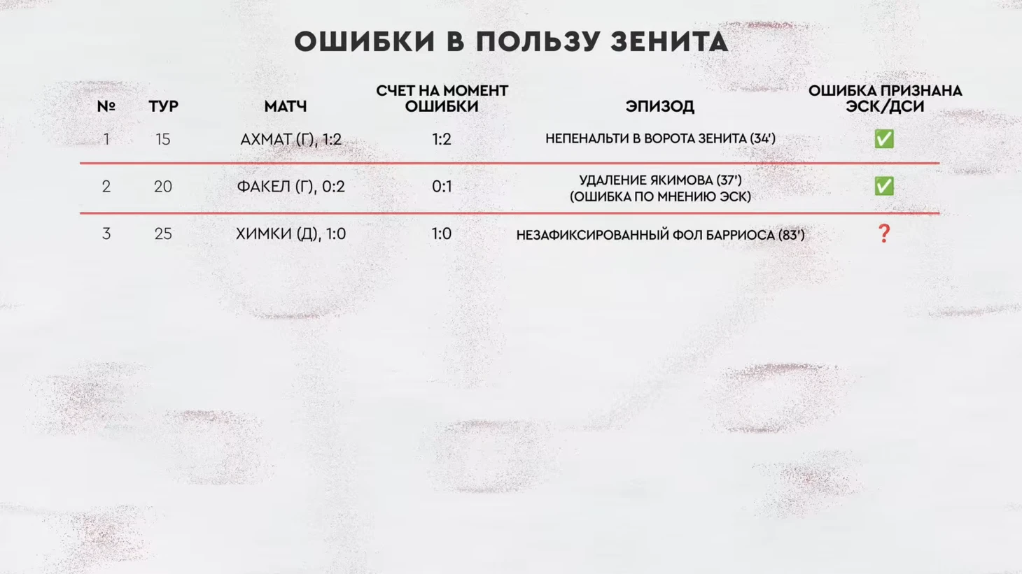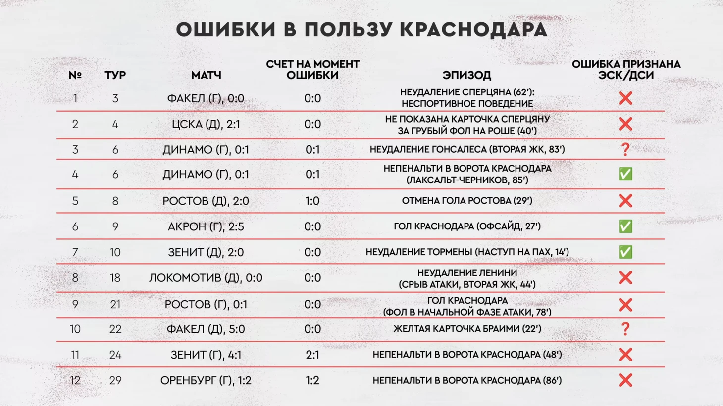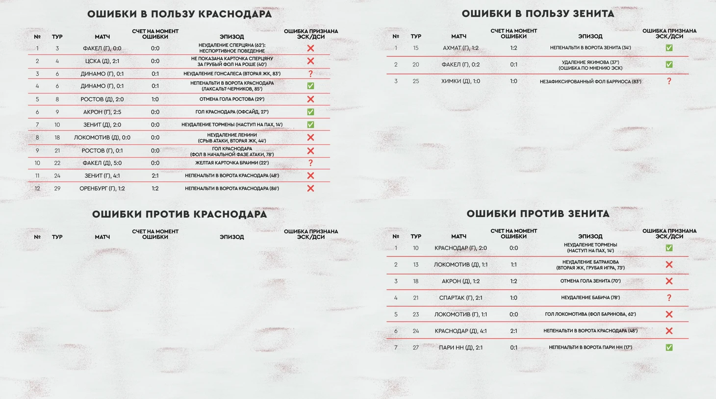 По результатам голосований насчитано 12 ключевых ошибок в пользу «Краснодара». Три из них признаны ЭСК/ДСИ. Отдельно стоит обратить внимание, что все из них напрямую повлияли на исход, так как допущены при ничейном или минимальном счёте. 0 ошибок обнаружено против «Краснодара», 3 – в пользу «Зенита», 8 – против (на скриншоте 7, но авторы забыли добавить второй отменённый гол в ворота «Акрона» в 18-м туре, который тоже признали ошибкой).