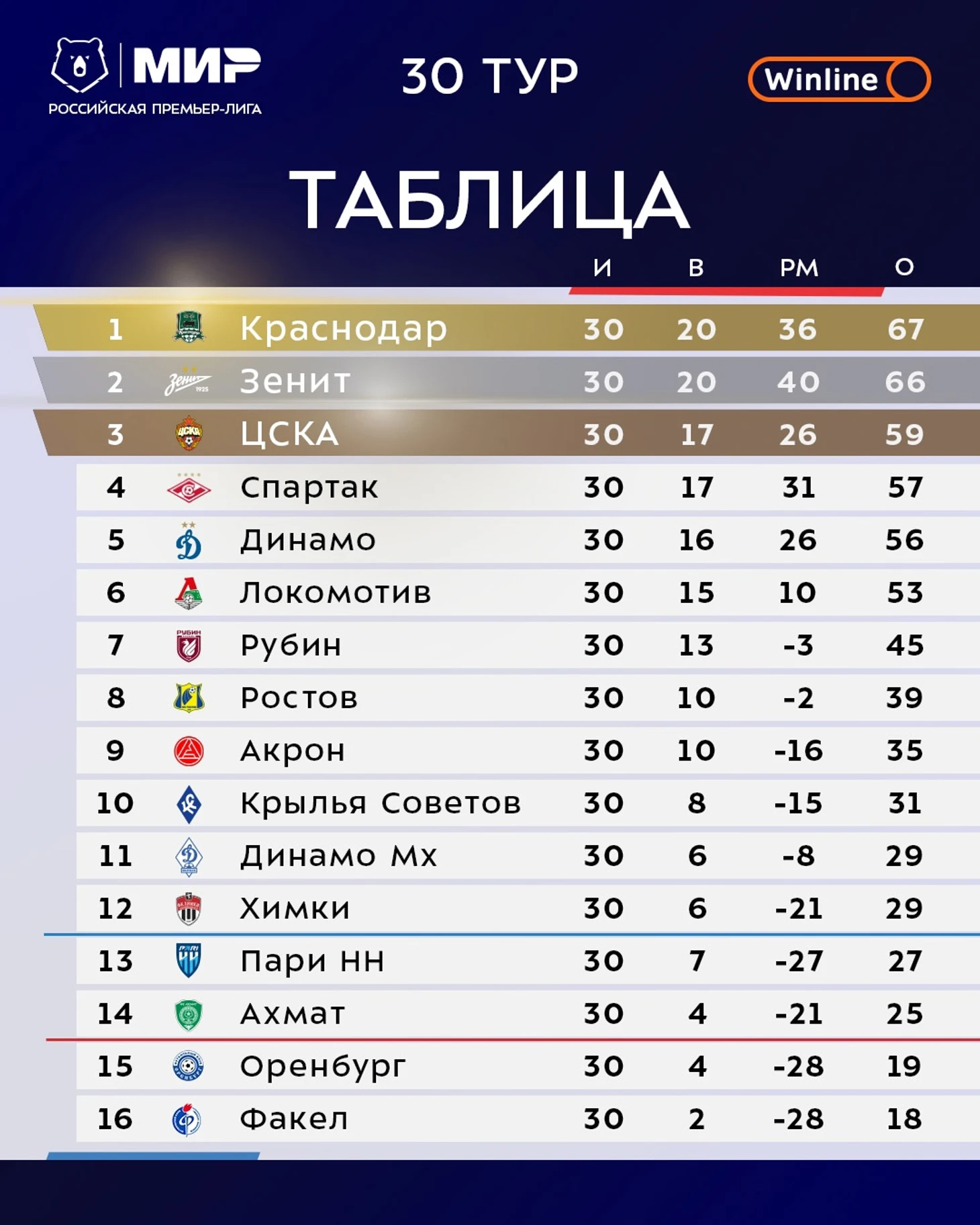 Sport24 пока не подвёл итоги 30-го тура, однако по их подсчётам «Зенит» должен был праздновать чемпионство ещё в 28 туре, а «Краснодар» в 30-м туре боролся бы за второе-пятое место с «Динамо», «Спартаком» и ЦСКА.