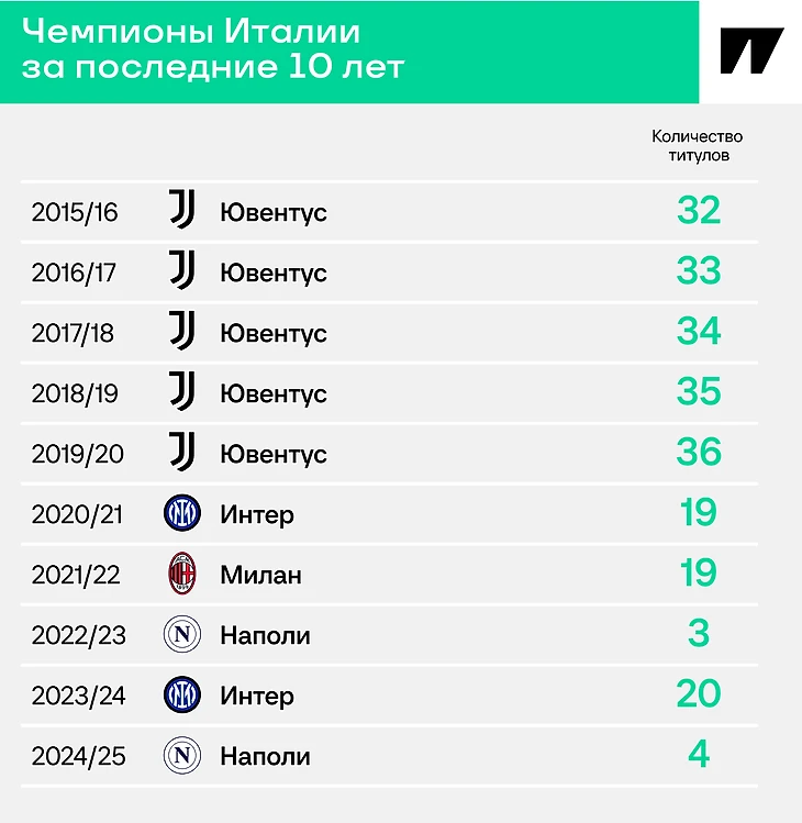 Антонио Конте прошел эту Серию А уже с третьей командой. После чемпионств с «Ювентусом» и «Интером» тренер принес скудетто и «Наполи». Ну и вообще статистика у Конте впечатляющая: шесть полноценных сезонов в Серии А – и пять побед.