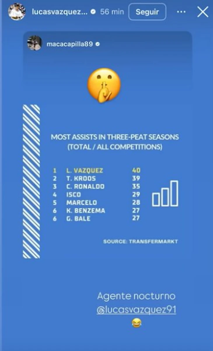 После прощального матча Лукаса с «Реалом Сосьедадом» на «Бернабеу» в минувшие выходные девушка поделилась в социальных сетях статистикой, которая показывает, что именно Васкес является лучшим ассистентом в «Мадриде» за последние три сезона.