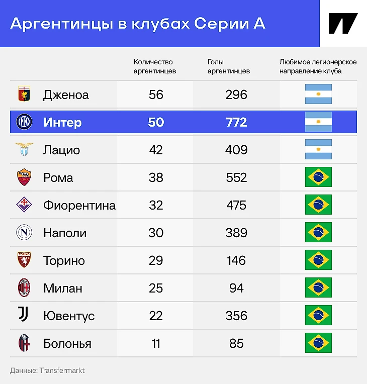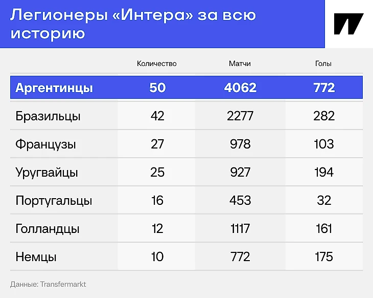 Никто не сделал для «Интера» больше, чем итальянцы и аргентинцы. Дзанетти и Камбьяссо входят десятку рекордсменов по количеству матчей. В десятке бомбардиров – тоже двое: Икарди на восьмом и Лаутаро на пятом.