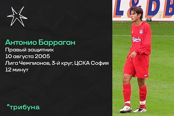 Довольно известный крайний защитник из Испании Антонио Барраган перешел в «Ливерпуль» в 2005 году из «Севильи». Дебют за основу не заставил себя долго ждать — он состоялся уже в августе, когда «мерсисайдцы» участвовали в отборе в Лигу Чемпионов. Испанец получил свои двенадцать минут в игре с софийским ЦСКА, заменив в конце победной встречи соотечественника Фернандо Морьентеса. В 2006 году он вернулся на родину, где сначала играл в Ла Лиге за «Депортиво», потом в Сегунде за «Реал Вальядолид», после чего на пять лет стал футболистом «Валенсии», в ту пору игравшей еще в Лиге Чемпионов. Сезон 2016/17 Антонио вновь провел в Англии, выступая за «Мидлсбро». Под конец карьеры Барраган вновь перебрался на родину, сначала в «Бетис», а затем и в «Эльче». Завершил карьеру защитник в 2022 году. Сейчас ему тридцать семь лет и он является ассистентом тренера в молодежной команде «Реал Бетиса».