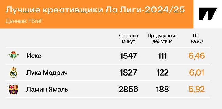 Оцените, это лидеры Ла Лиги по предударным действиям на 90 минут. Иско, играя за «Бетис», с отрывом опережает Луку Модрича и Ламина Ямаля. Категорически мощно!