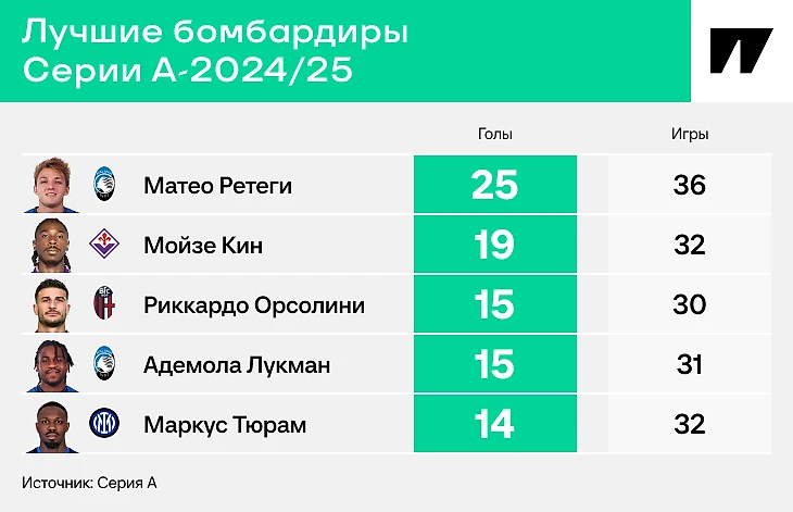 ● Впервые за три сезона лучший бомбардир Серии А – итальянец. До Матео Ретеги из местных лучшим был Чиро Иммобиле в сезоне-2021/22. В этом году вообще весь топ-3 бомбардиров чемпионата – итальянцы.