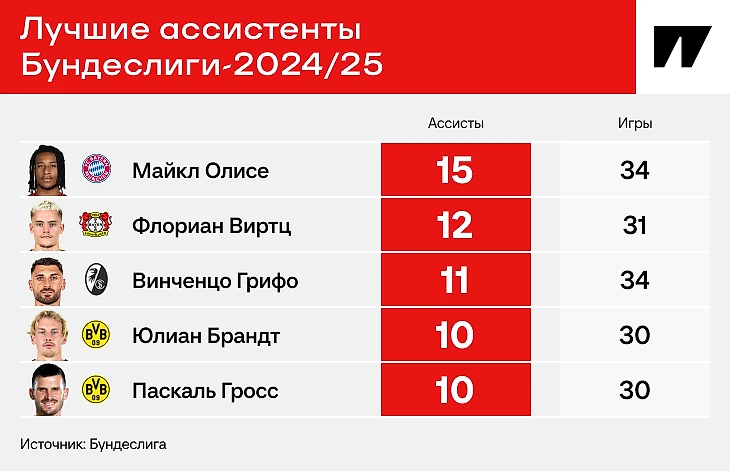 ● Майкл Олисе и Паскаль Гросс разрывают после перехода из АПЛ. Француз за сезон стал главным вингером «Баварии», а умный полузащитник наконец-то показал себя в более-менее топовом клубе.