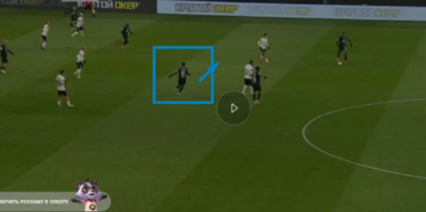 1. В данном эпизоде Эдуард с мячом связывает линии, играет в оттяжке, стягивает на себя игроков (оставляя страховку сзади в случае неудачного решения) и прежде всего обостряет, исполняет, продвигает, ищет варианты для передачи (например, на Кривцова в разрез). Это подчеркивает его важность для игровой структуры, а также вариативность его и «Краснодара» в розыгрышах. Это один из многих эпизодов, где Сперцян играет в оттяжке, но есть и другие, где он находится в более высокой позиции с мячом, создавая пространство партнерам.