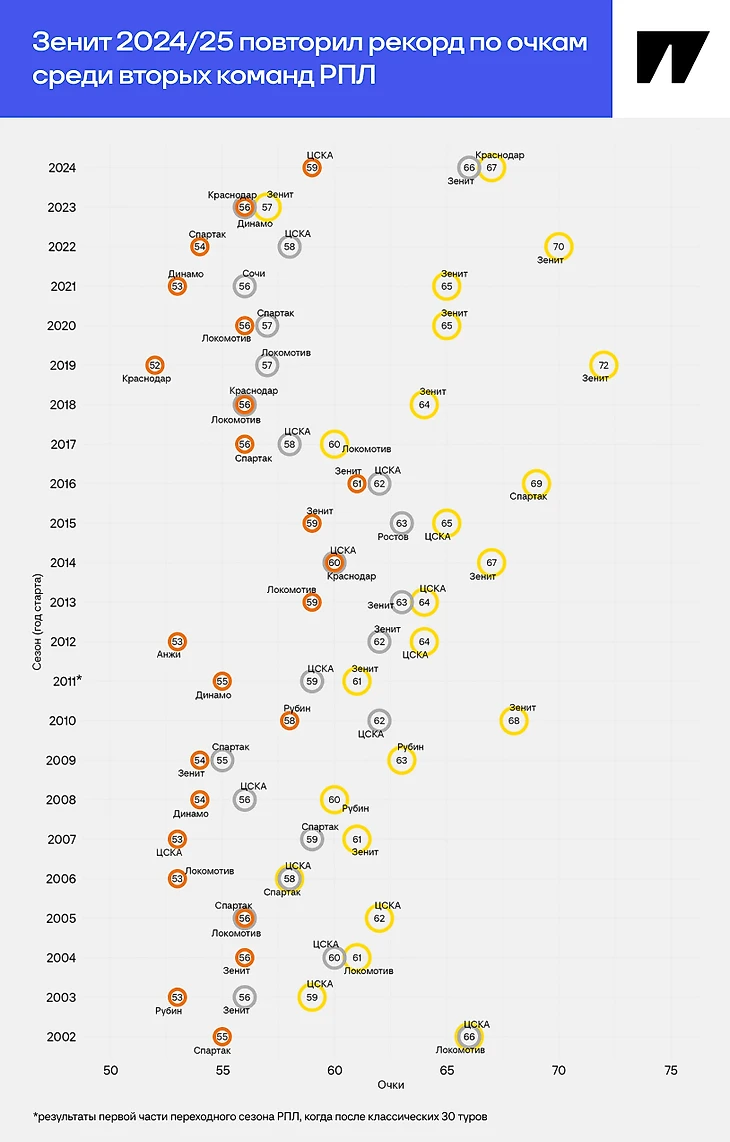 1. Впервые с 2002-го команда с 66 очками не взяла титул в РПЛ (об этом уже сказал Сергей Семак). Но даже тогда эта планка позволила побиться за победу в золотом матче («Локомотив» победил ЦСКА).
