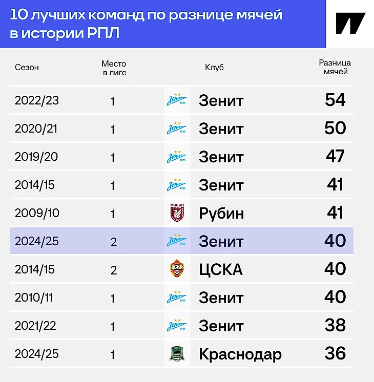 5. «Зенит» показал шестую в истории РПЛ разницу мячей.