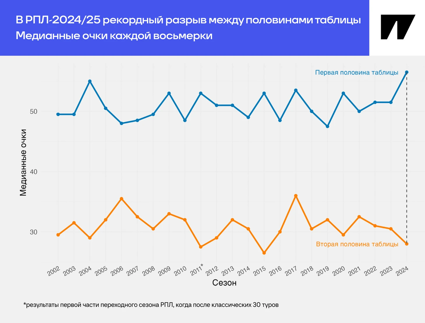 Примечание: медианное значение – планка, которую преодолели половина команд из каждой половины. Преимущество в сравнении со средним количеством очков в том, что на медиану не влияют отклонения, когда один клуб-аутсайдер может значительно испортить общую картину.