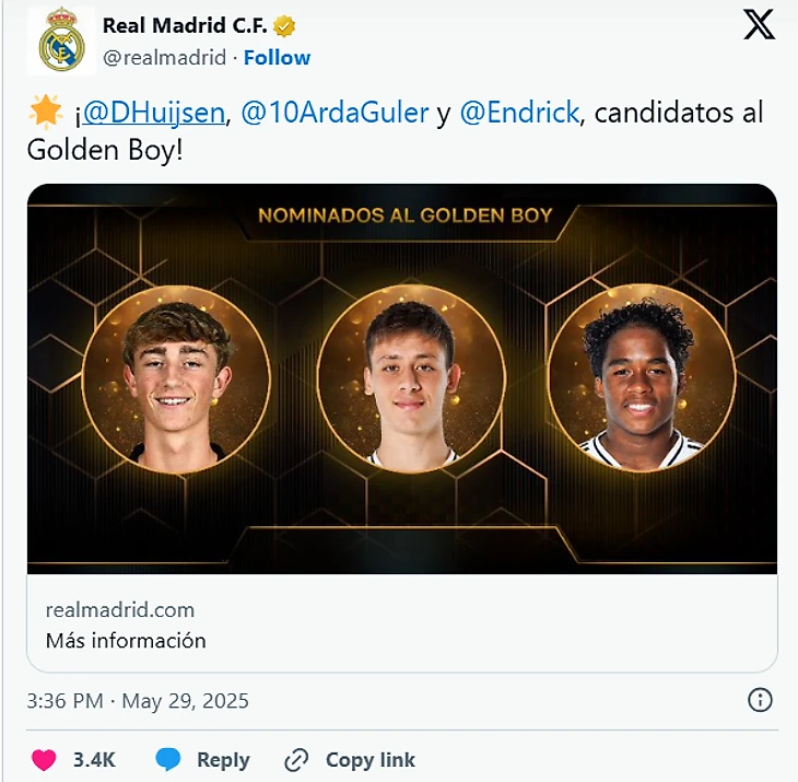 В шорт-лист из 100 лучших молодых футболистов Европы попали Эндрик, Арда Гюлер и новичок мадридцев Дин Хейсен.