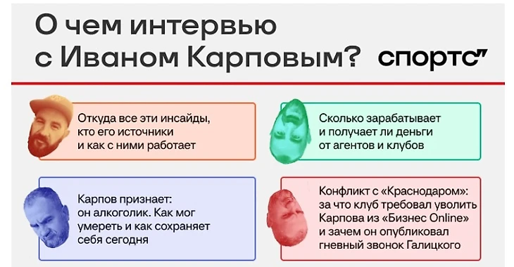 Карповым я ранее не интересовался, но прочитал его интервью на Sports.ru. Там он изображает из себя «алкоголика и придурка», без образования, одной почкой и одним яичком, с отставанием в развитии и страстью к загулам. Однако не скрывает, что эта бурная деятельность является обычным бизнесом. В реальности Карпов коренной москвич, а его дед работал в МИД и был переводчиком у Хрущева, то есть он не какой-то там социальный маргинал.