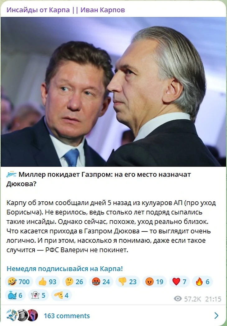 Несколько дней назад я прочитал «инсайд» журналиста Ивана Карпова, что Медведев якобы покинет должность председателя правления «Зенита». Получается, прогноз не состоялся. И тут я вспомнил про то, что тот же Карпов 24 февраля написал, что Алексей Миллер уйдет с руководства ПАО «Газпром», а его место займет глава дочерней «Газпром нефти» Александр Дюков.
