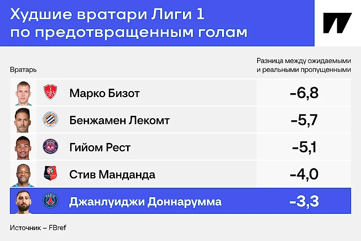 Суть статистики в том, что берется фактическая острота всех ударов соперника по воротам (в xG), и из нее вычитается реальное количество пропущенных голов. Йеванн Диуф из «Реймса» предотвратил 14,6 мячей, Яхья Фофана из «Анжера» – 12,5, Донован Леон из «Осера» – 10,8, Джордже Петрович из «Страсбура» – 9,9, Люка Шевалье из «Лилля» – 7,2. Между ними и Доннаруммой – пропасть. Итальянец занимает 32-е место из 36.