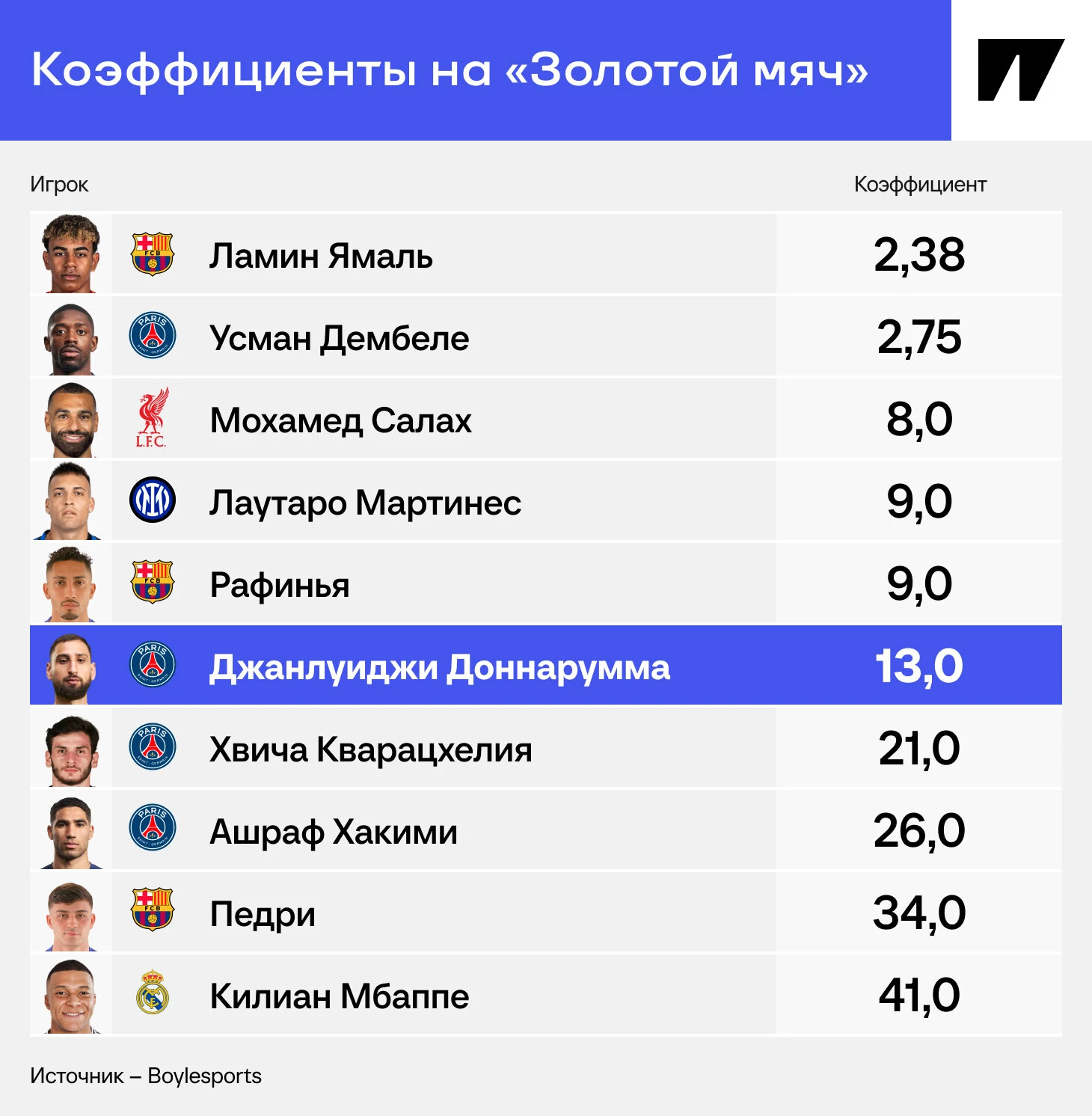 На саму награду плевать, дело в другом: футбольный мир реально считает Доннарумму одним из лучших игроков евросезона, иначе таких коэффициентов бы не было. Для контекста: других вратарей высоко среди претендентов нет, на Яна Зоммера – заоблачный коэффициент 100 (большинство букмекеров оценивают шансы еще ниже), на остальных – ничего лучше 1000.