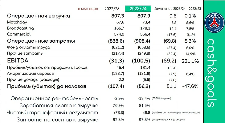 В отчете же можно увидеть рекордную прибыль от трансферов - 181 млн (помогли крупные продажи арабским клубам, в т.ч. трансферы Неймара и Верратти). Она позволила перекрыть сумму амортизации (131,6 млн) и получить положительный чистый трансферный результат (49,8 млн), который уменьшил сумму убытка до относительно приличных 56,3 млн. Но это 5-й убыточный сезон подряд, а совокупный убыток с 2020 года составил 889 млн.
