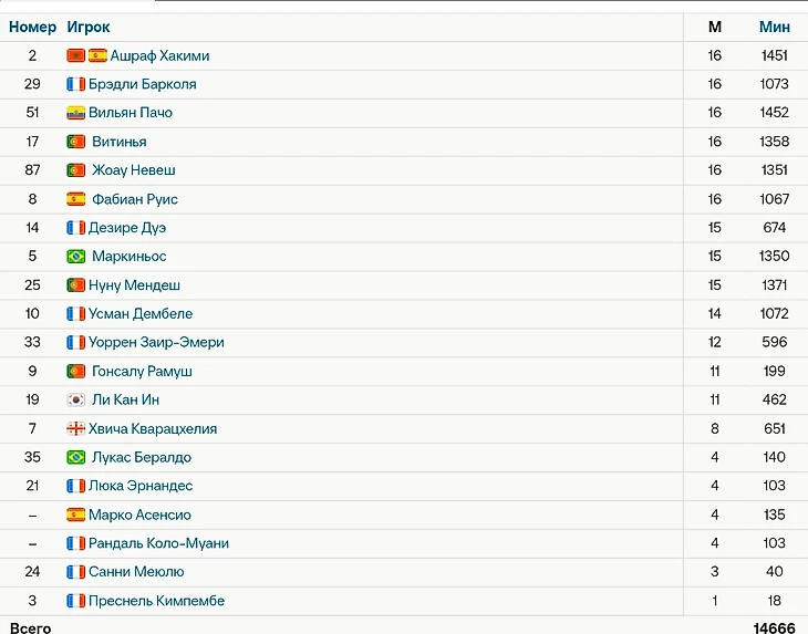 В ПСЖ лидер снова Хакими, а так же Бартоли, Пачо, Витинья, Невеш, Руис. Всё они поучавствовали во всех 16-ти матчах турнира, при этом Хакими был всего один раз заменен