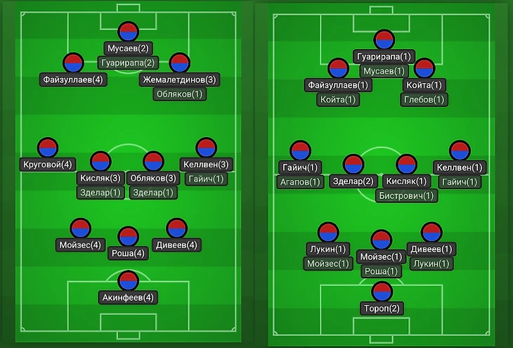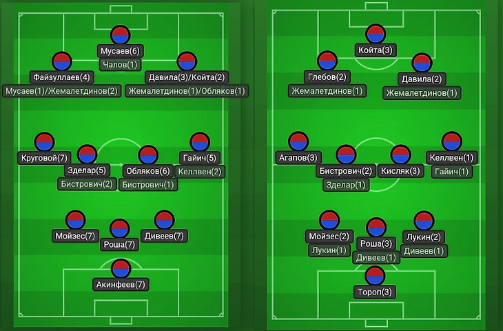 Стартовые составы на этом отрезке говорят нам о том, что Марко Николич определился с фланговыми нападающими. Ими стали Аббос Файзуллаев и Рифат Жемалетдинов (до травмы в игре с Ахматом), а также Келлвен начал выигрывать конкуренцию у Милана Гайича, Матвей Кисляк стал получать больше игрового времени в центре поля, заменяя Сашу Зделара. Николич искал более креативную, работоспособную альтернативу Зделару в центре поля, поэтому решение попробовать воспитанника клуба было очень удачным.