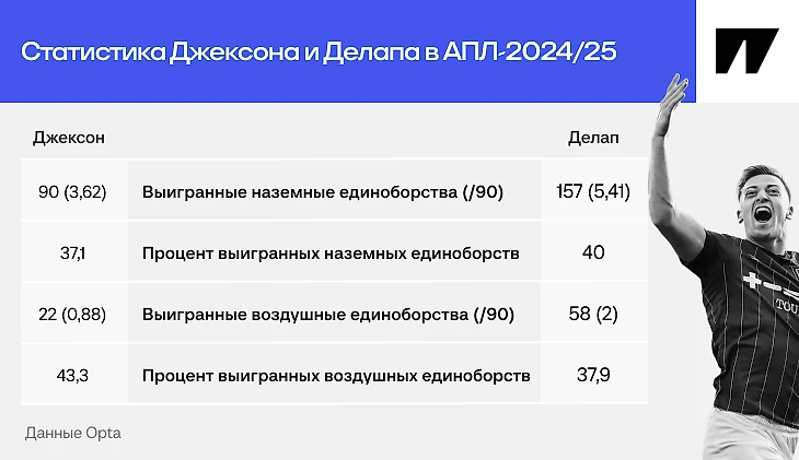 Цифры подтверждают эти данные. Если сравнить Джексона и Делапа в плане единоборств, то в этом сезоне Лиам заметно лучше как в наземных, так и в верховых.