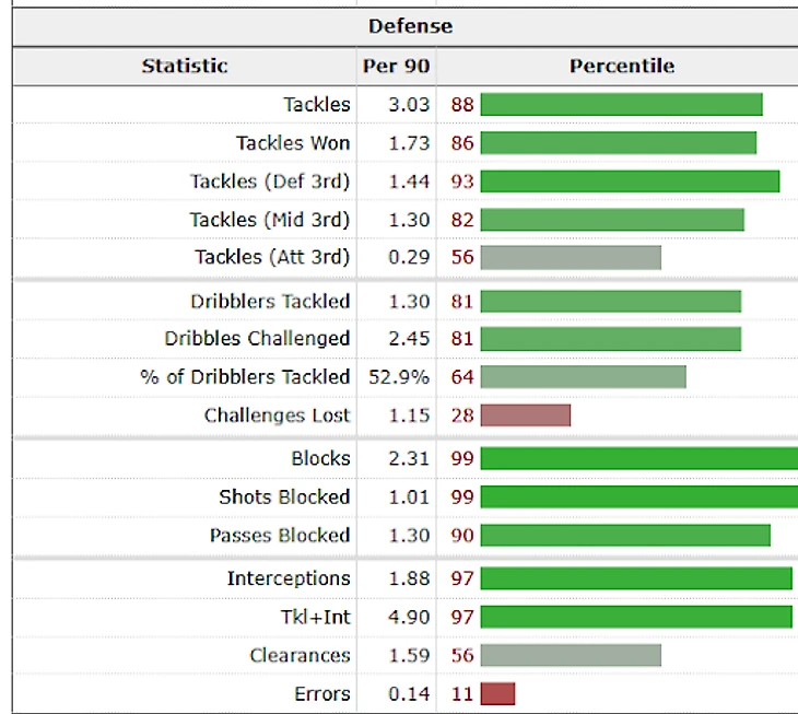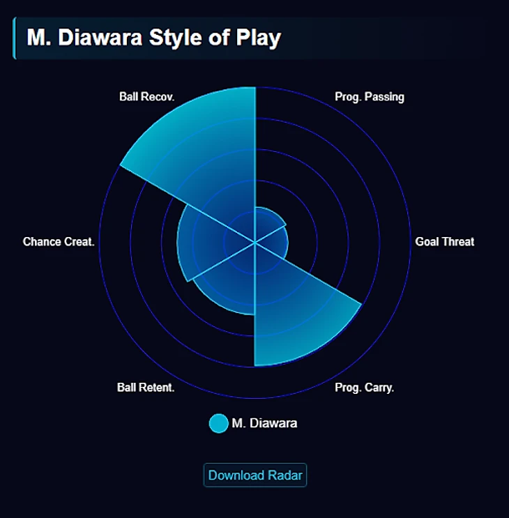 Первый в списке — Маамаду Диавара, 20-летний опорник, принадлежащий «Лиону», но проведший вторую часть сезона на правах аренды в «Гавре». Несмотря на скромный опыт в профессиональном футболе, его статистика впечатляет: Он входит в топ-5% среди всех игроков в пяти сильнейших лигах Европы по таким показателям, как блоки, перехваты и совокупное число отборов и перехватов