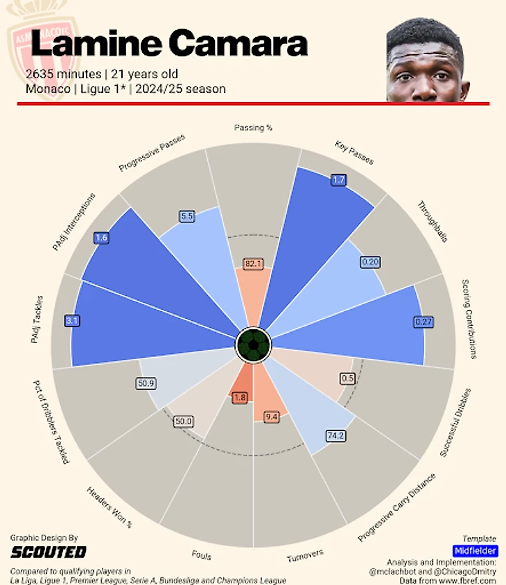 Не Ямаль! А если серьезно, то он выглядтит гораздо более готовым к уровню Премьер-лиги. Воспитанник «Меца», перешедший в «Монако» прошлым летом, Камара стал одним из самых ярких молодых полузащитников Лиги 1, набрав 9 баллов по системе «гол+пас» за сезон. Это универсальный игрок, который одинаково полезен и в отборе, и в продвижении мяча, и в завершающей стадии атак.