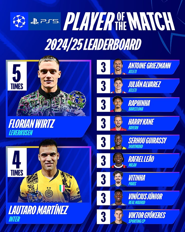 Абсолютным рекордсменам по наградам игроку матча стал Флориан Виртц, немец пять раз в Лиге чемпионов сезона-2024/25 получал заветный приз – в матчах против «Фейеноорда», «Милана», «Бреста», «Зальцбурга» и пражской «Спарты». Все встречи проходили на этапе лиги, в матче с «Брестом» «фармацевты» поделили ничью, остальные игры закончились победой «Байера».