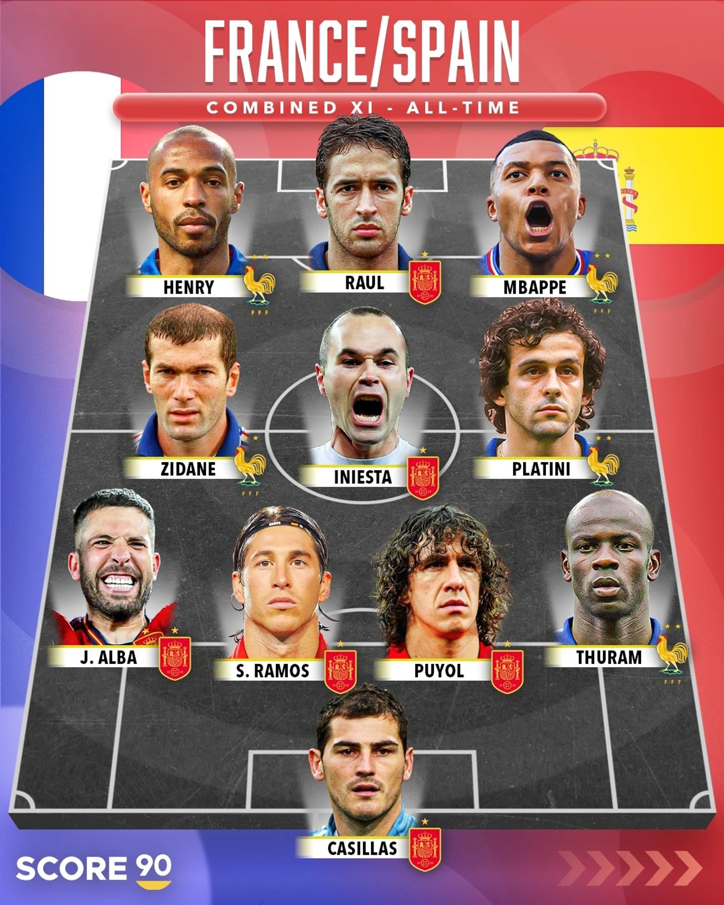В преддверии очередной встречи национальных команд портал Score90 составил символическую сборную из футбольных легенд Испании и Франции.