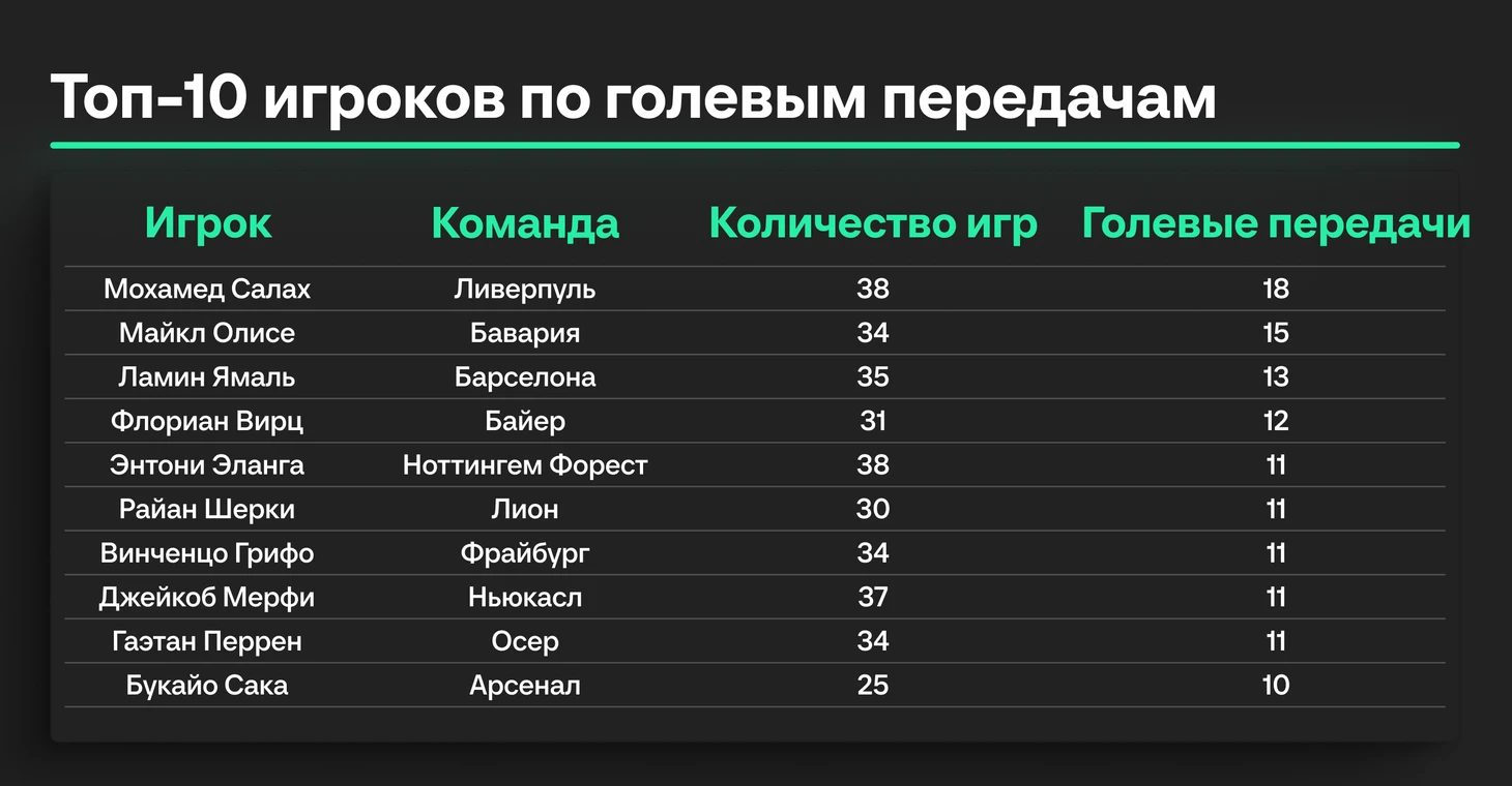 Мохамед Салах — на уверенном первом месте в Европе по голевым передачам. Звезда «Баварии» Майкл Олисе — на втором. Немного от них отстал 17-летний Ламин Ямаль.