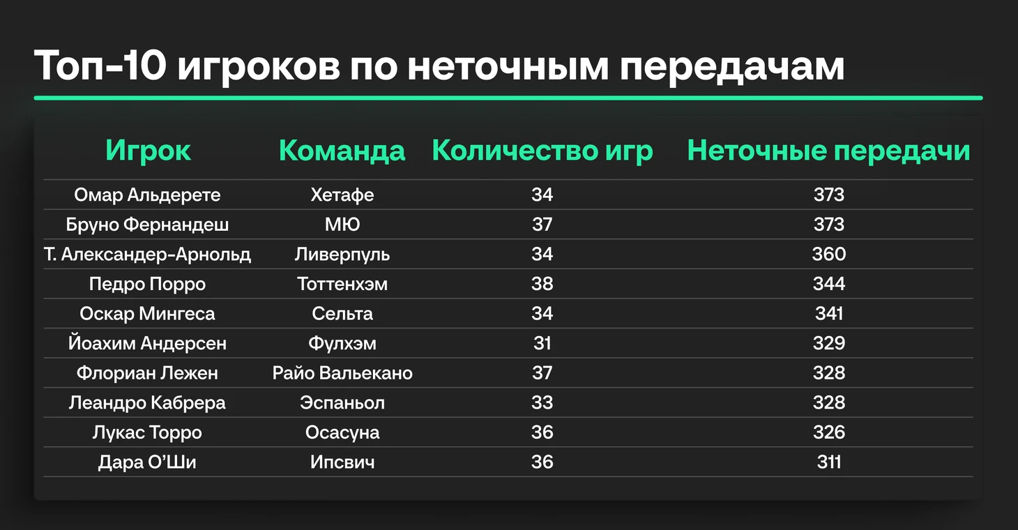 И снова в лидерах «Хетафе» — на этот раз первую строчку забирает центральный защитник Омар Альдете. Парагваец чаще всех в этом сезоне пасовал сопернику. Как и у большинства других представителей этого топа, подобная неточность объясняется большим количеством произведенных выносов.