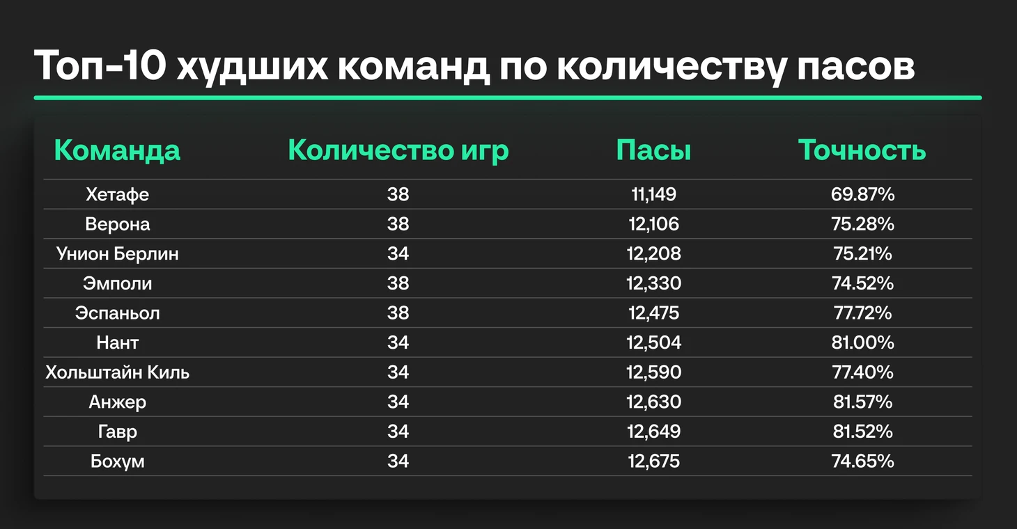 Среди команд, не представленных в этом списке, лучшая средняя точность передач — у «Ювентуса» — 88.06% (передаем привет Тьяго Мотте).
