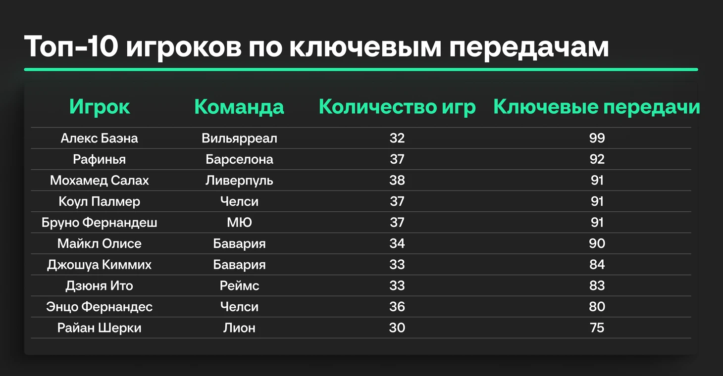 Добро пожаловать на вторую часть нашего большого обзора статистики клубного сезона топ-5 европейских лиг-24/25. В первой части мы рассказали, кто из команд и игроков больше всего забивал и бил по воротам. Сегодня речь пойдет о тех, кто чаще всех пасовал и отдавал голевые передачи. Приятного прочтения.