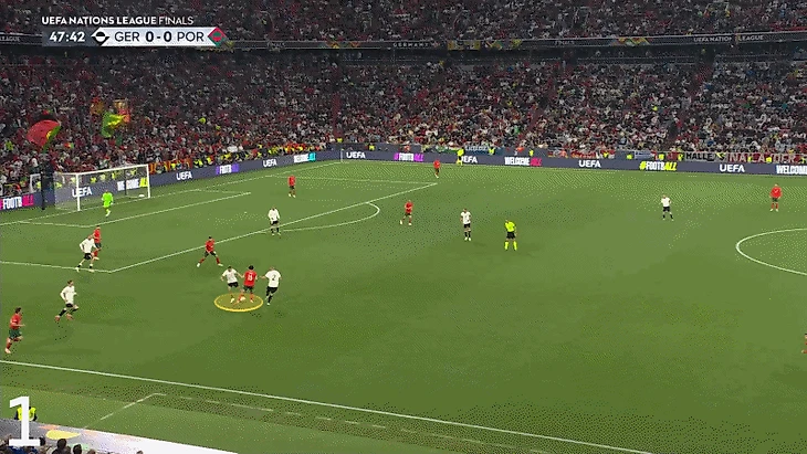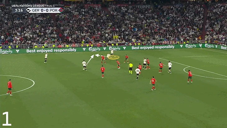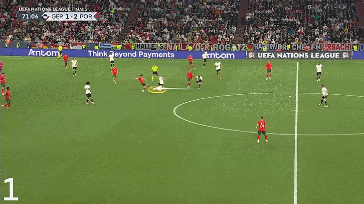 Несмотря на то, что не все попытки Виртца удавались, недостатка в творчестве не было. В один момент он подхватывает мяч в глубине своей половины и проникает справа на территорию Португалии...