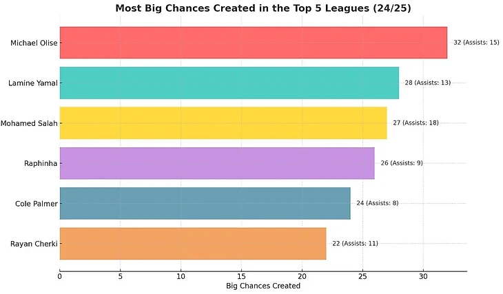 Логично предположить, что больше подобных моментов создают игроки группы атаки. Самые известные и результативные в этом сезоне Ламин Ямаль и Мо Салах, но они с результатом 28 и 27 созданных моментов соответственно стали вторым и третьим.