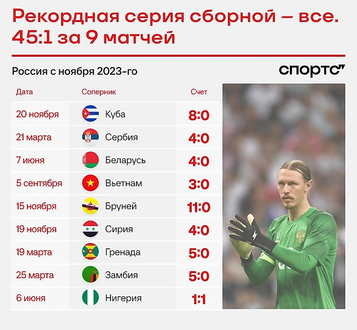 За время бана сборная России провела 19 товарищеских матчей – 11 побед, семь ничьих и поражение от молодежки Египта, когда играли смешанными составами. Команда Валерия Карпина не просто громила всех подряд полтора года, но и не пропускала – суммарно было 44:0 в восьми матчах. Теперь сыграли 1:1 с Нигерией.