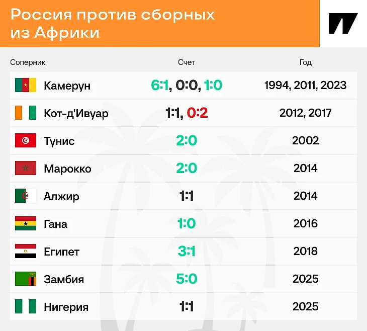 Россия провела 14 официальных игр против африканских сборных. Нигерия – девятый соперник из Африки. Россияне обыграли шестерых: всех кроме Кот-д’Ивуара, Алжира и Нигерии.
