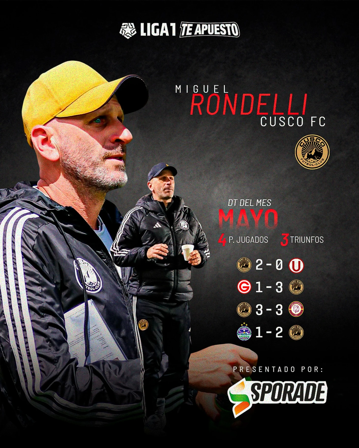Одной из лучших команд мая также был ФК «Куско». В четырех матчах у них три победы и одна ничья. Среди побежденных команд – «Университарио» и «Депортиво Гарсиласо». Успехи не остались незамеченными. Главный тренер клуба Мигель Рондельи стал лучшим тренером месяца. За «Куско» также играет лучший по голевым пасам в лиге Иван Кольман, а также один из лучших бомбардиров чепмионата Факундо Кальехо. В мае за четыре матча он забил 6 голов и отдал одну голевую передачу. Именно его признали лучшим игроком мая в Лиге 1.